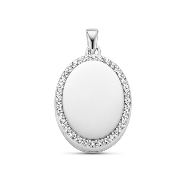 Ein wunderschönes glänzendes ovales Medaillon mit einem Rand aus Steinen. Lasse das Medaillon gravieren und mache es zu einem einzigartigen Erinnerungsstück. Füge ein Bild an der Innenseite ein und trage diene Liebsten so immer bei dir.